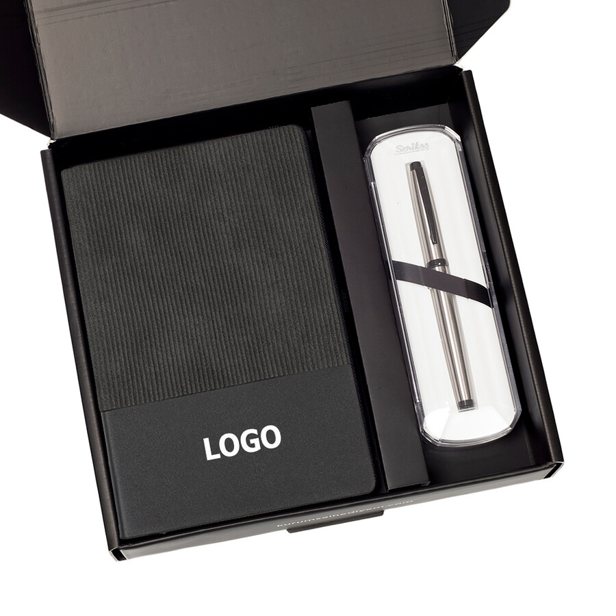 Kutu, defter ve kalem üzerine logo baskı yapılabilir. Baskılar fiyata dahildir. Aynı setin farklı renk seçenekleri vardır.