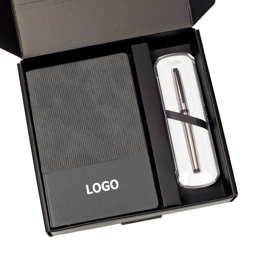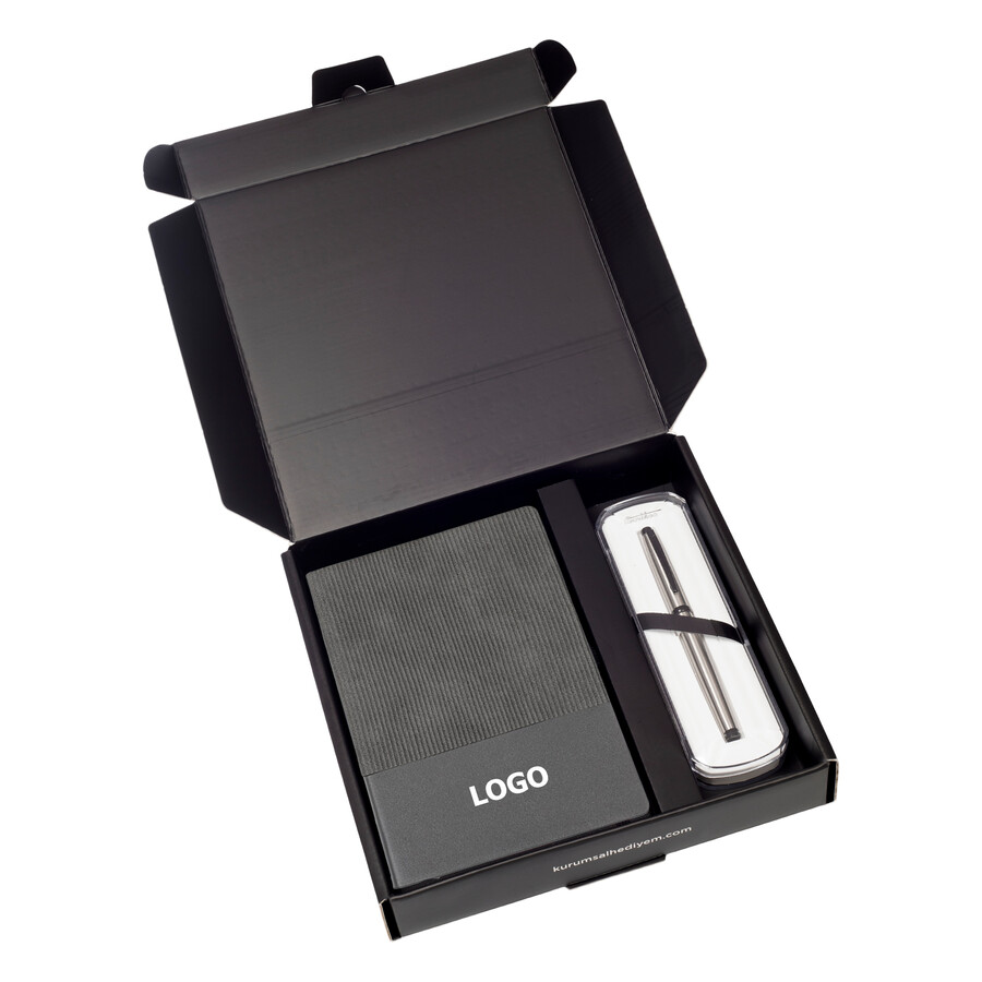 Kutu, defter ve kalem üzerine logo baskı yapılabilir. Baskılar fiyata dahildir. Aynı setin farklı renk seçenekleri vardır.