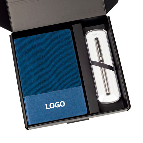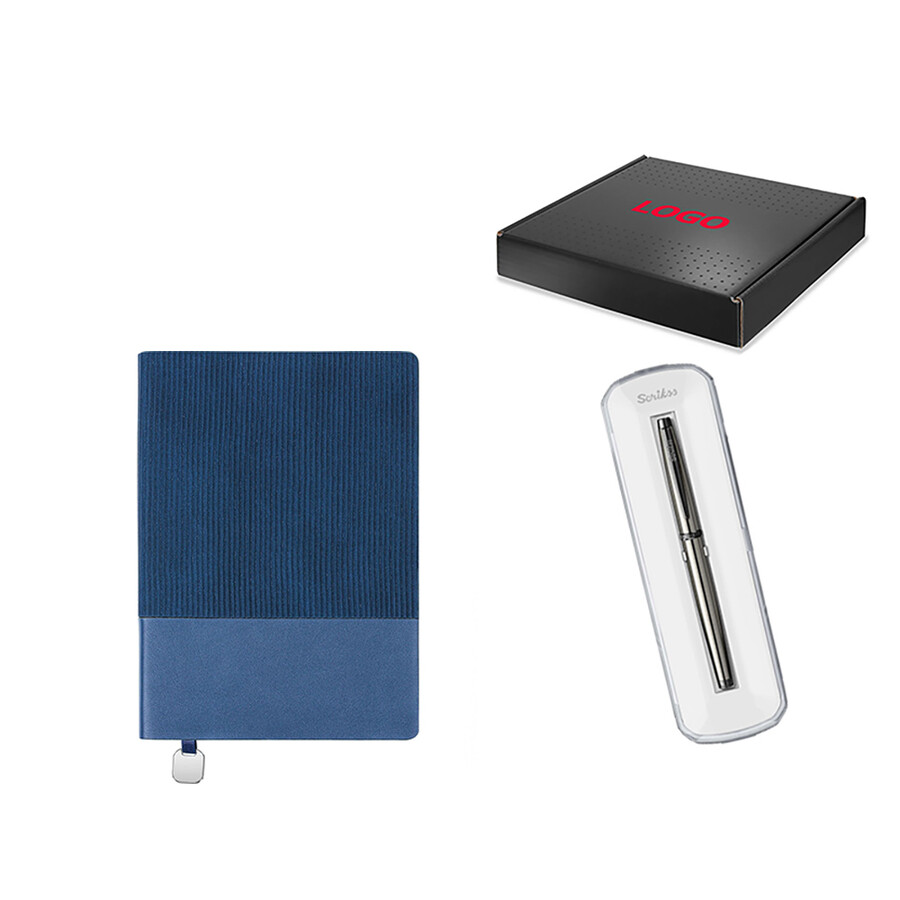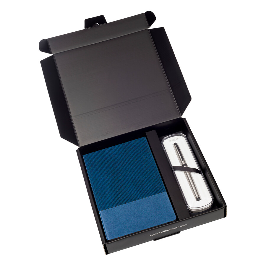 Kutu, defter ve kalem üzerine logo baskı yapılabilir. Baskılar fiyata dahildir. Aynı setin farklı renk seçenekleri vardır.