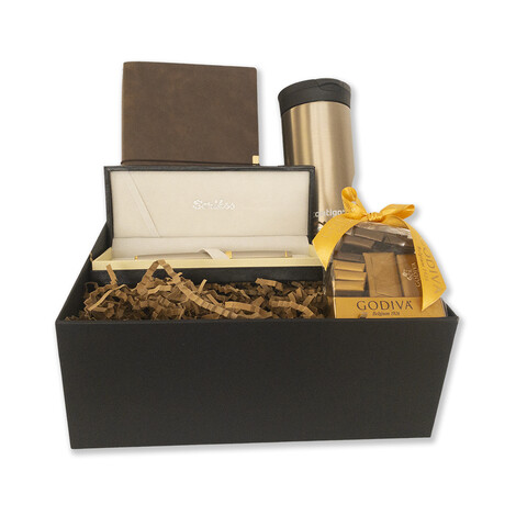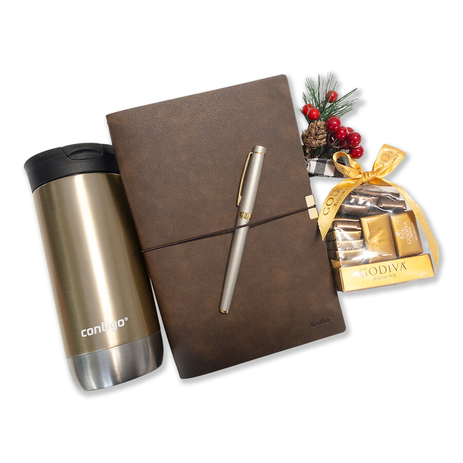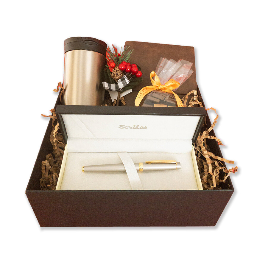 Hediye kutusu, termos, defter ve kalem üzerine logo baskı fiyata dahildir.